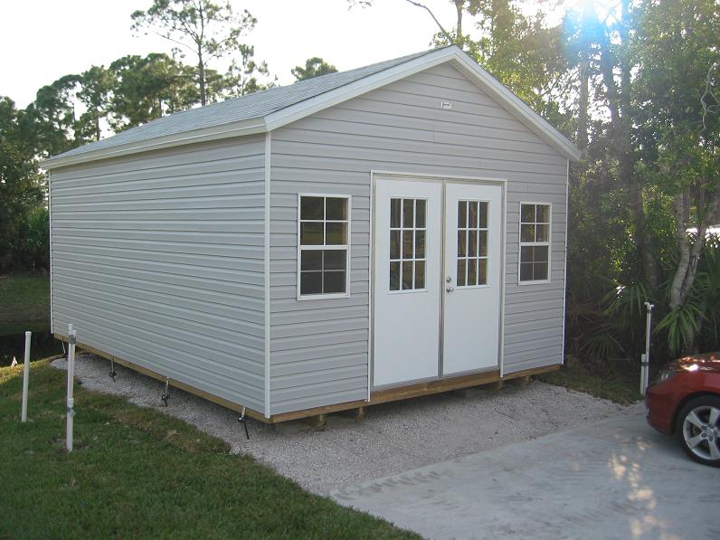 The shed is pre-fab building installed on a prepared, gravel pad and anchored with some huge augurs for hurricane protection. Those of us in Florida are envious of people with basements or garages in more temperate climates. This thing is roughly 14 feet wide by 20 feet long. Watching the workers maneuever it into position along the dirt road and through the winding and tree-lined driveway was a hoot. In the background is a corner of the pond. That tells us what we need to know about the water table. During the rainy season, the level is higher.