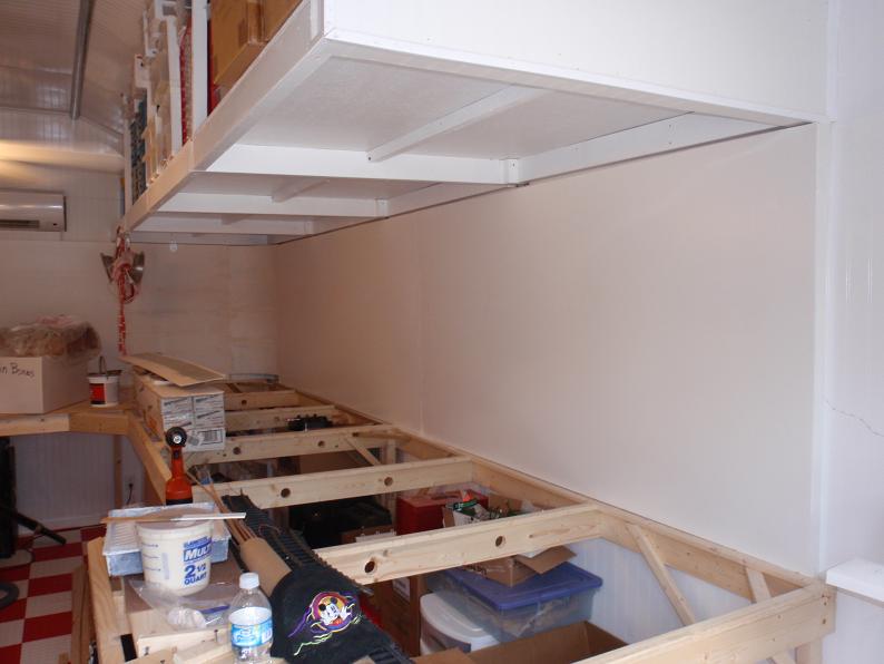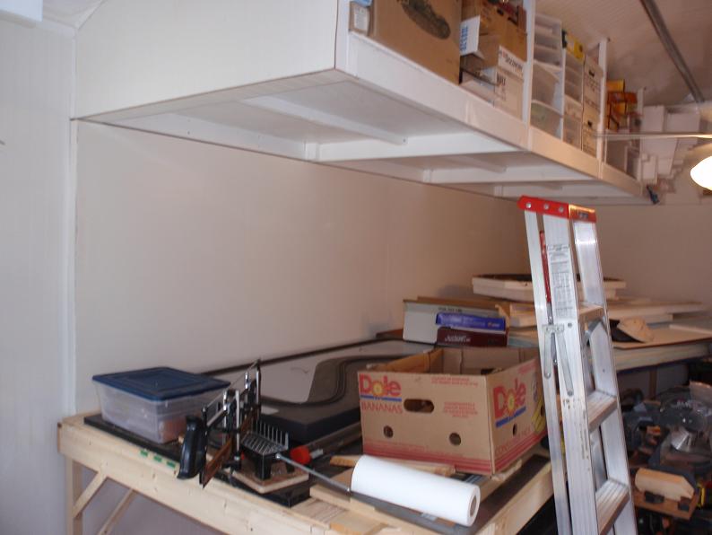 Here is the third side showing a bit less clutter and the basic benchwork. I used L-girders made from dimensional lumber and supported by 2x2 legs. Before assembling the benches, I cut holes for routing the wires. Even with the storage shelves above, I will need a lot of storage below. With boxes, bins and me going in and out, I want to be sure the wires ar out of the way.