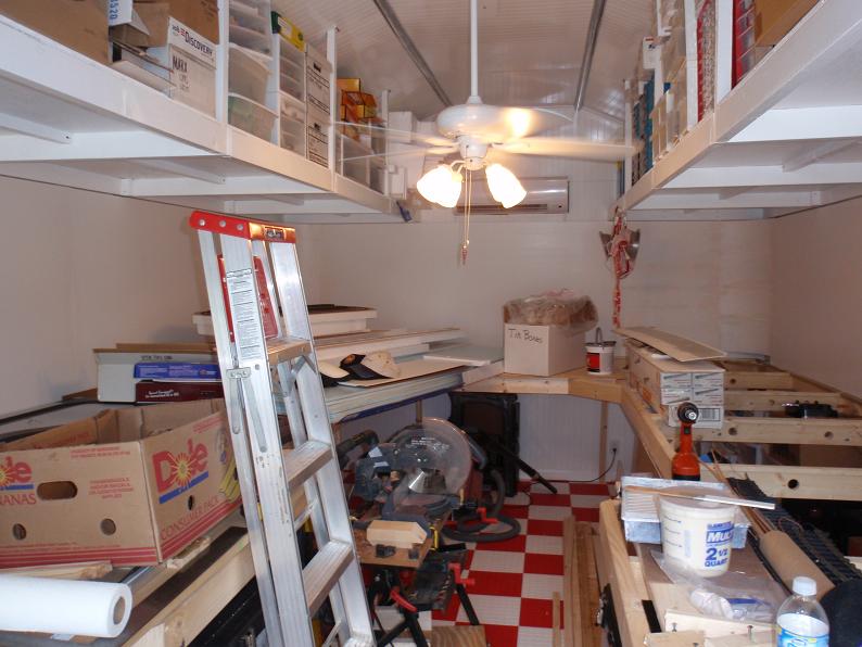 After the shed was delivered, I built some steps in front and arranged for power, lighting and A/C. Then, I built some shelves above where the layout will be, insulated the whole thing and put up interior paneling and trim. The final step in the infrastructure was the flooring. That stuff is plastic tiles that snap together. They are designed for garage flooring, provide a little more insulation and resist paints, glues and the other things I will certainly spill.